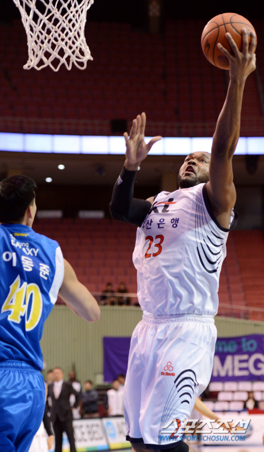 프로농구 서울 삼성과 부산 KT의 경기가 6일 잠실실내체육관에서 펼쳐 졌다. 부산 KT 존슨(오른쪽)이 레이업슛을 시도하는 가운데 뒷편의 관중석이 텅텅 비어있는 모습. 잠실=조병관기자 rainmaker@sportschosun.com/2013.03.06/ |