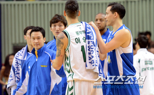 강동희 감독의 승부조작 혐의로 위기를 맞은 프로농구 서울 삼성과 원주 동부의 경기가 10일 잠실실내체육관에서 펼쳐 졌다. 서울 삼성 선수들이 경기를 마치고 팀 분위기가 어수선한 동부 이승준을 위로해 주고 있다. 잠실=조병관기자 rainmaker@sportschosun.com/2013.03.10/