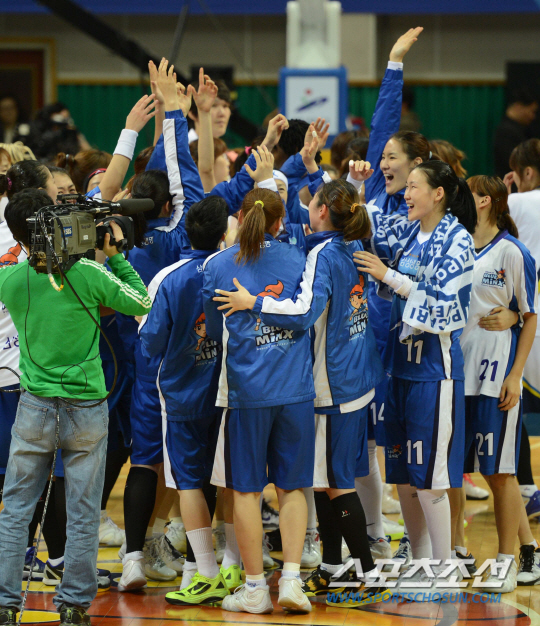 11일 오후 안산 와동체육관에서 2012-2013 여자프로농구 삼성생명과 신한은행의 플레이오프 3차전이 열렸다. 72대 68로 승리하며 챔프전행을 확정지은 삼성생명 선수들이 환호하고 있다. 안산= 김경민 기자 kyungmin@sportschosun.com / 2013.03.11.