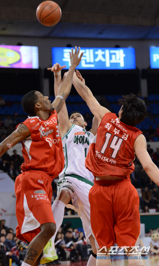프로농구 서울 SK와 원주 동부의 경기가 19일 잠실학생체육관에서 펼쳐 졌다. 원주 동부 이승준(가운데)이 서울 SK 헤인즈와 최부경의 수비를 앞에 두고 페이드 어웨이 슛을 시도하고 있다. 잠실=조병관기자 rainmaker@sportschosun.com/2013.03.19/