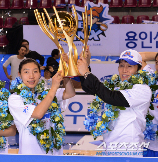 | 19일 오후 용인실내체육관에서 2012-2013 여자프로농구 챔피언결정전 3차전 우리은행과 삼성생명의 경기가 열렸다. 66대53으로 승리를 거두며 우승을 차지한 우리은행 위성우 감독과 주장 임영희가 우승 트로피를 들어올리며 기뻐하고 있다. 용인=김경민 기자 kyungmin@sportschosun.com / 2013.03.19. |
