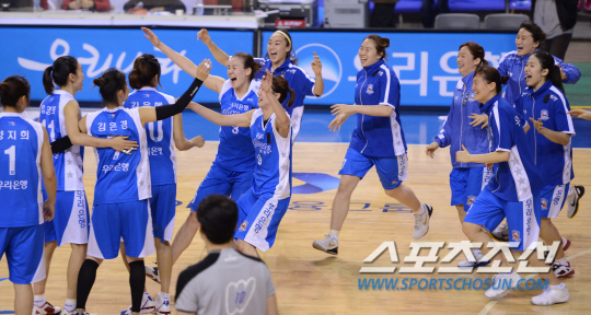 | 19일 오후 용인실내체육관에서 2012-2013 여자프로농구 챔피언결정전 3차전 우리은행과 삼성생명의 경기가 열렸다. 66대53으로 승리를 거두며 우승을 차지한 우리은행 선수들이 기뻐하고 있다. 용인=김경민 기자 kyungmin@sportschosun.com / 2013.03.19. |