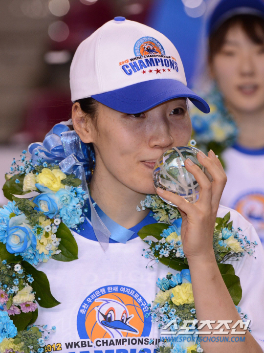 | 19일 오후 용인실내체육관에서 2012-2013 여자프로농구 챔피언결정전 3차전 우리은행과 삼성생명의 경기가 열렸다. 66대53으로 승리를 거두며 우승을 차지한 우리은행 임영희가 MVP로 뽑힌 후 트로피에 입을 맞추고 있다. 용인=김경민 기자 kyungmin@sportschosun.com / 2013.03.19. |