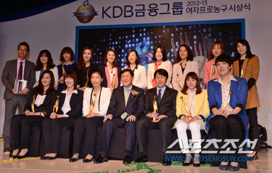 26일 오전 그랜드하얏트서울 호텔에서 2012-2013 여자프로농구 시상식이 열렸다. 시상식 후 모든 수상자들이 무대위에서 포즈를 취하고 있다. 김경민 기자 kyungmin@sportschosun.com / 2013.03.26.