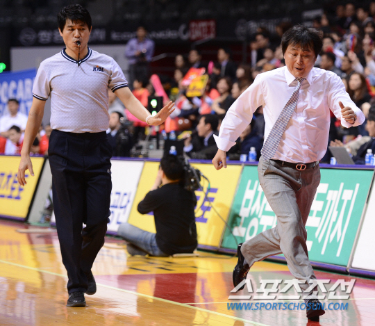 26일 고양실내체육관에서 2012-2013 프로농구 6강 플레이오프 3차전 고양 오리온스와 안양 KGC의 경기가 열렸다. KGC 이상범 감독이 심판에게 오리온스 전태풍의 플레이를 재연하면서 트레블링이 아니냐며 항의하고 있다. 고양=정재근 기자 cjg@sportschosun.com/2013.03.26/