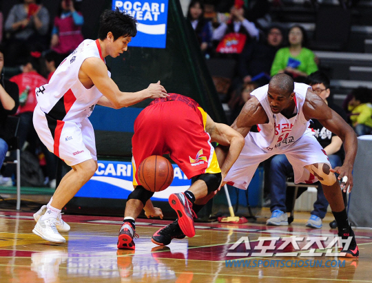 전태풍이 중앙에서 공을 잡았다. 김태술은 영리하게 수비했다. 왼쪽 돌파에 능한 전태풍의 방향을 제대로 읽었다. 결국 왼쪽으로 돌파를 감행한 전태풍의 스텝을 제대로 미리 파악했다. 철저하게 붙으면서 따라갔다. 하지만 전태풍은 몸싸움을 이겨내며 레이업슛까지 시도했다. 그런데 그 전에 전태풍의 팔꿈치가 김태술의 안면을 강타했다. 입술에 피가 났다.