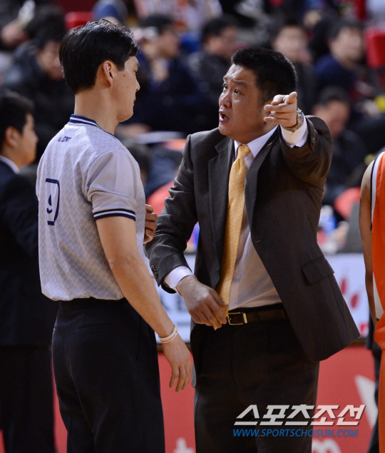 13일 오후 인천 삼산체육관에서 2012-2013 프로농구 고양 오리온스와 인천 전자랜드의 경기가 열렸다. 전자랜드 유도훈 감독이 심판 판정에 강하게 항의하고 있다. 인천=김경민 기자 kyungmin@sportschosun.com / 2013.03.13.