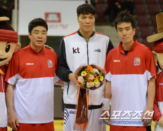 28일 안양실내체육관에서 2012-2013 프로농구 안양 KGC와 부산 KT의 경기가 열렸다. 안양에서의 마지막 경기를 앞둔 부산 서장훈이 안양 김성철, 은희석으로부터 꽃다발을 받은 후 기념촬영을 하고 있다. 안양=정재근 기자 cjg@sportschosun.com/2013.02.28/ |