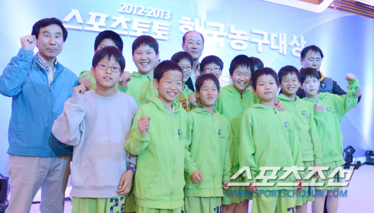 2012-2013 스포츠 조선 제정 스포츠토토 한국농구대상 시상식이 24일 서울 JW메리어트 호텔에서 열렸다. 제5회 전국 학교스포츠클럽 농구대회에 출전해 우승한 알로이시오 초등학교 선수들이 김선형 최부경등 선수들과 기념촬영을 하고 있다. 메리어트=최문영 기자 deer@sportschosun.com /2013.04.24/