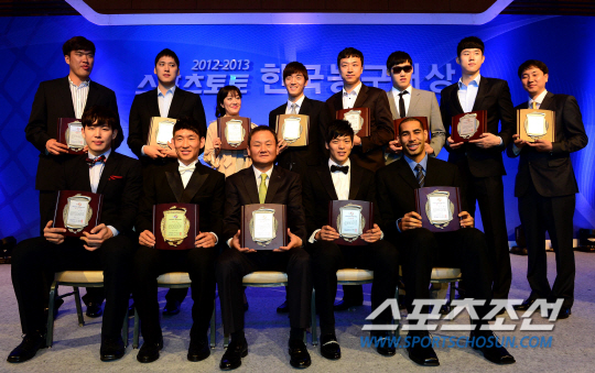| 24일 오전 서울 서초구 반포동 JW 메리어트호텔 그랜드볼룸에서 2012-2013 스포츠조선제정 스포츠토토 한국농구대상 시상식이 열렸다. MVP를 수상한 모비스 양동근과 올 시즌 영광의 수상자들이 함께 기념 포즈를 취하고 있다. 반포동=송정헌 기자 songs@sportschosun.com/2013.4.24 |