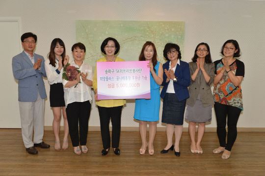2012~13시즌 정규리그 챔피언 SK나이츠(단장 이성영)가 지난 13일 서울 송파구청에서 SK나이츠와 러브러브봉사단이 지난 시즌 모금한 러브쿠폰 판매대금중 일부인 500만원을 희망플러스-꿈나래 통장 후원금으로 박춘희 송파구청장에게 전달했다.
