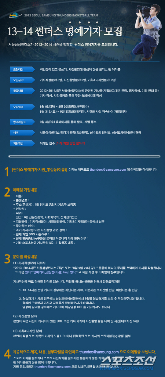 삼성 썬더스 농구단은 2013-2014시즌 구단 소식을 현장에서 생생하게 전달해주는 썬더스 명예기자를 모집한다.