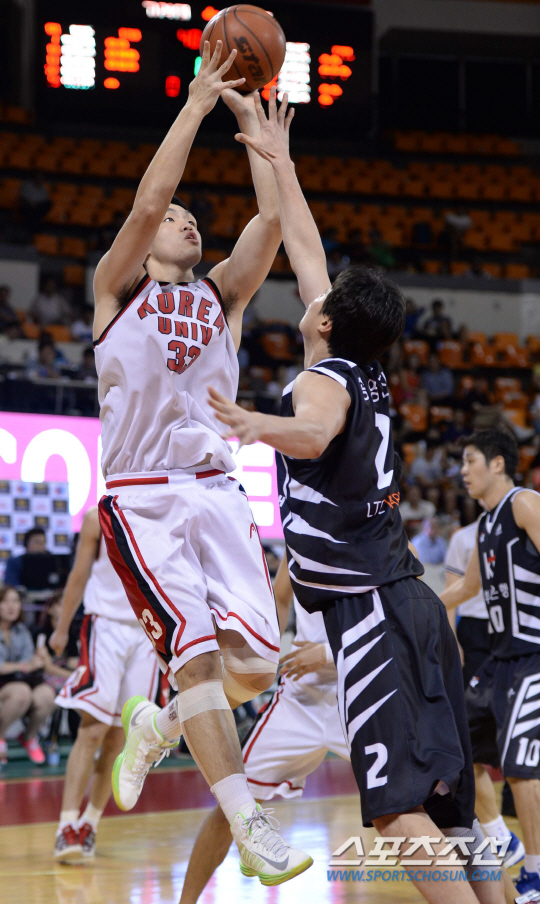 19일 오후 서울 잠실학생체육관에서 2013 프로-아마 최강전 8강 KT와 고려대학교의 경기가 열렸다. 고려대 이승현(왼쪽)이 KT 송영진의 마크를 넘어 슛을 시도하고 있다. 잠실학생체육관=김경민 기자 kyungmin@sportschosun.com / 2013.08.19. |