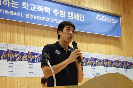 23일 전주 동암고등학교에서 열린 '카파-KCC 이지스가 함께하는 학교폭력 추방 캠페인'. 이날 행사에는 추승균 코치를 비롯해 임재현 강병현 김효범 신명호 박경상 이한권 등 KCC 주전 선수들이 대거 참석했다.