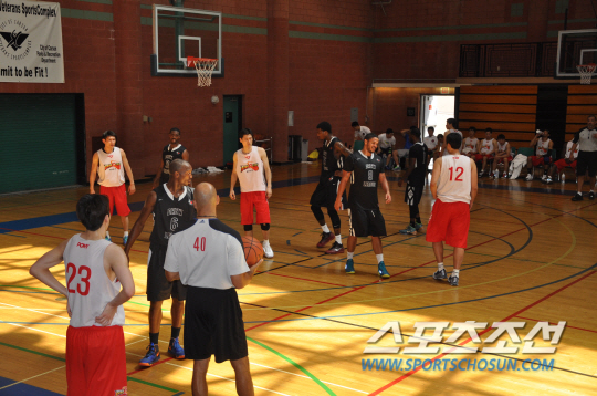 | ◇미국 LA 현지 연합팀과 연습경기를 치르고 있는 모비스 선수들. LA=김 용 기자 awesome@sportschosun.com |