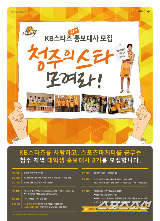창단 50주년을 맞이한 청주 KB국민은행 스타즈 여자농구단이 WKBL 2013~2014시즌을 앞두고 청주 지역연고 활성화에 기여할 대학생 홍보대사를 모집한다.