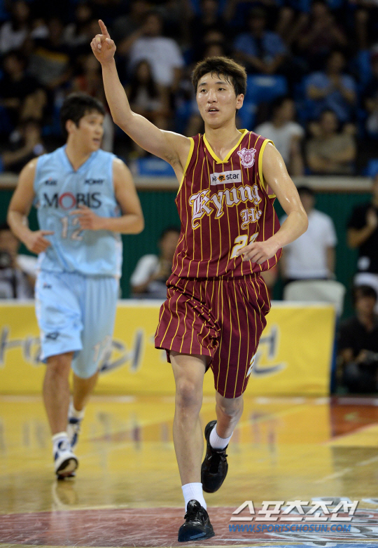 20일 잠실학생체육관에서 프로-아마 최강전 모비스와 경희대의 8강전 경기가 열렸다. 경희대 김민구가 3쿼터 결정적인 어시스트를 성공시키고 손을 들어 보이고 있다. 잠실=송정헌 기자 songs@sportschosun.com