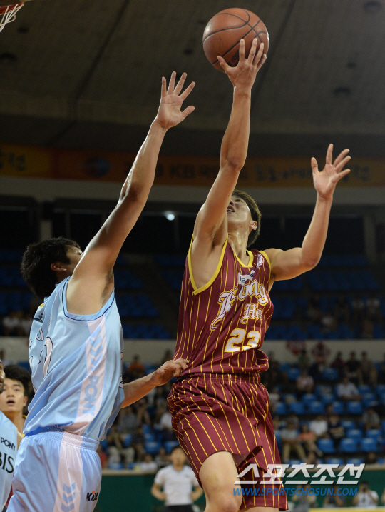 20일 잠실학생체육관에서 프로-아마 최강전 모비스와 경희대의 8강전 경기가 열렸다. 경희대 김민구가 모비스 함지훈을 앞에 두고 레이업슛을 시도하고 있다. 잠실=송정헌 기자 songs@sportschosun.com/2013.8.20