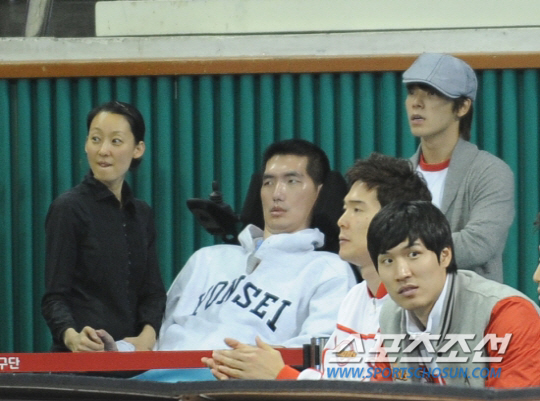 ◇루게릭병과 싸우고 있는 박승일 전 모비스 코치(왼쪽 두 번째)가 지난 2011년 아이돌 그룹 슈퍼주니어의 가수 동해(오른쪽 뒤)와 함께 농구장을 찾아 모비스의 경기를 관전하고 있다. 스포츠조선 DB