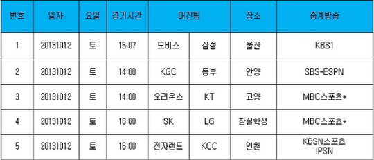 오후 2시에 열리는 KGC-동부전(안양)과 오리온스-KT전(고양)은 SBS-ESPN과 MBC스포츠플러스가 각각 생중계한다.