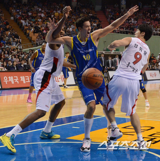 삼성 썬더스가 홈 개막전에서 우승 후보로 꼽히는 KGC를 제압했다. 삼성은 12일 모비스에 완패했지만 하루 만에 달라진 경기력을 보여주었다. 13일 오후 서울 잠실실내체육관에서 2013-14 프로농구 KGC와 삼성의 경기가 열렸다. 삼성 이동준이 KGC 에반스의 반칙에 볼을 놓치고 있다. 잠실=김경민 기자 kyungmin@sportschosun.com / 2013.10.13. |