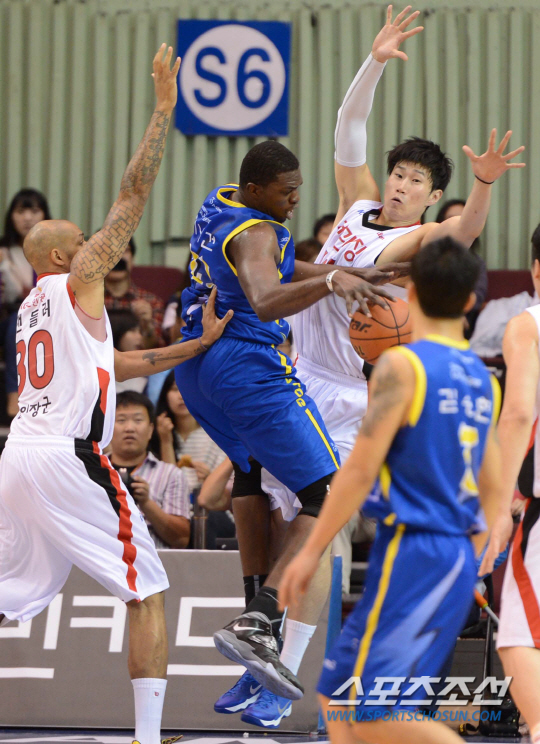 더니건은 삼성이 2013~14시즌을 대비해 영입한 빅맨이다. 그는 지난 13일 KGC전 도중 왼발 엄지 발가락을 다쳐다. 뼈에는 이상이 없었다. 최대 2주 진단을 받았다. 하지만 더니건은 22일 현재 러닝을 하지 못하고 있다고 김동광 삼성 감독이 말했다. 13일 오후 서울 잠실실내체육관에서 2013-14 프로농구 KGC와 삼성의 경기가 열렸다. 삼성 더니건(가운데)이 KGC 오세근(오른쪽)과 챈들러의 마크를 넘어 패스를 시도하고 있다. 잠실=김경민 기자 kyungmin@sportschosun.com