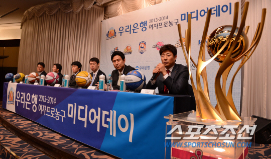 이제 새로운 시즌이 시작된다. '우리은행 2013~2014 여자 프로농구'가 10일 오후 1시20분 춘천호반체육관에서 열리는 우리은행과 신한은행의 개막전을 시작으로 내년 3월까지 5개월 동안 열전에 들어간다. 5일 오전 서울 리베라 호텔에서 우리은행 2013-2014 여자프로농구 타이틀 스폰서 조인식 및 미디어데이가 열렸다. 미디어데이에서 각팀 감독이 인사말을 하고 있다. 김경민 기자 kyungmin@sportschosun.com / 2013.11.05.