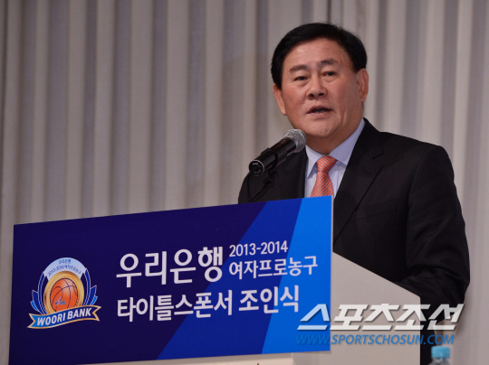 5일 오전 서울 리베라 호텔에서 우리은행 2013-2014 여자프로농구 타이틀 스폰서 조인식 및 미디어데이가 열렸다. 타이틀 스폰서 조인식에서 WKBL 최경환 총재가 인사말을 하고 있다. 김경민 기자 kyungmin@sportschosun.com / 2013.11.05. |
