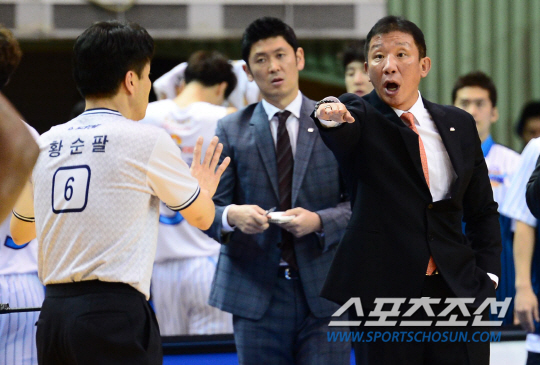 프로농구 서울 삼성과 전주 KCC의 경기가 17일 잠실 실내체육관에서 펼쳐 졌다. 전주 KCC 허재 감독이 2쿼터 경기중 황순팔 심판에게 항의를 하고 있다. 잠실=조병관기자 rainmaker@sportschosun.com/2013.11.17/ |