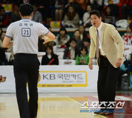 홈 26연승을 달리고 있는 SK가 4연승의 상승세를 탄 오리온스와 홈에서 맞붙었다. 2013-2014 프로농구 서울 SK와 고양 오리온스의 경기가 20일 서울 잠실학생체육관에서 열렸다. SK 문경은 감독이 사이드라인을 살짝 밟으며 심판에게 항의하고 있다. 잠실학생체=정재근기자 cjg@sportschosun.com/2013.11.20/ |