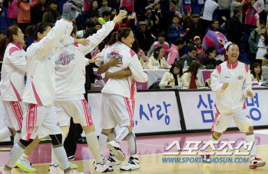 25일 부천실내체육관에서 여자농구 하나외환과 신한은행의 경기가 열렸다. 하나외환이 신한은행에 69대67로 승리하며 개막 후 4연패에서 벗어났다. 승리가 확정되자 환호하고 있는 하나외환 선수들. 부천=송정헌 기자 songs@sportschosun.com/2013.11.25 |
