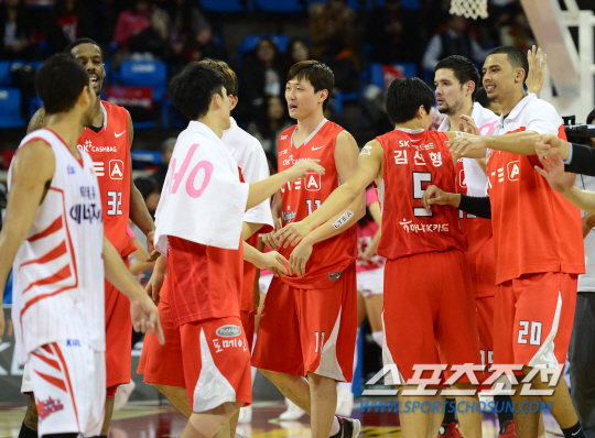 홈 26연승을 달리고 있는 SK가 4연승의 상승세를 탄 오리온스와 홈에서 맞붙었다. 2013-2014 프로농구 서울 SK와 고양 오리온스의 경기가 20일 서울 잠실학생체육관에서 열렸다. 오리온스에 승리하며 홈 27연승을 달린 SK 선수들이 승리의 기쁨을 만끽하고 있다. 잠실학생체=정재근기자 cjg@sportschosun.com/2013.11.20/ |