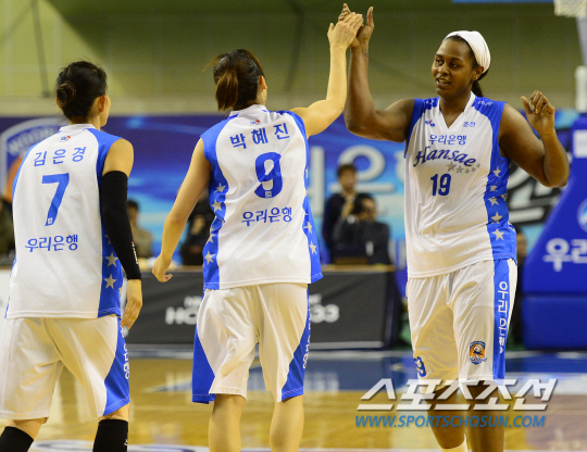 우리은행과 신한은행의 2013-2014 여자프로농구 개막전이 10일 강원도 춘천호반체육관에서 열렸다. 우리은행 박혜진이 4쿼터 막판 승리에 쐐기를 박는 3점슛을 성공시킨 후 굿렛과 하이파이브를 하고 있다. 홈팀 우리은행은 지난 시즌 모두의 예상을 깨고 여자농구 통합챔피언이 됐다. 신한은행은 지난 시즌 이전까지 통합 6연승의 대업을 이룬 전통의 강호다. 춘천=정재근기자 cjg@sportschosun.com/2013.11.10/ |