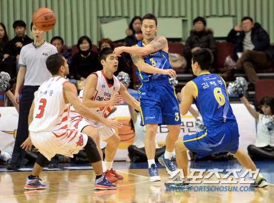남자농구 삼성 썬더스가 2연승을 달리면서 시즌 10승을 달성했다. 서울 삼성과 고양 오리온스의 2013-2014 프로농구 경기가 6일 잠실실내체육관에서 열렸다. 삼성 김승현이 오리온스 전태풍 한호빈의 수비를 피해 패스를 시도하고 있다. 잠실실내=허상욱 기자 wook@sportschosun.com/2013.12.06/ |