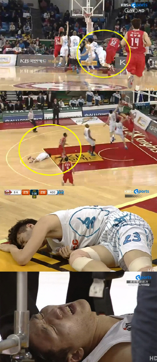 지난 14일 잠실학생체육관에서 열린 남자프로농구 서울 SK와 전주 KCC의 경기 2쿼터 중반 KCC 신인 가드 김민구(22)가 코트에 쓰러진 채 몸을 떨며 극심한 고통을 호소했다. SK 용병 헤인즈와의 충돌 때문.