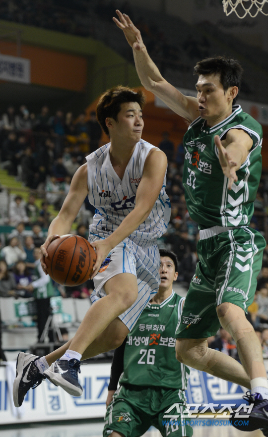 원주 동부와 전주 KCC의 2013-2014 프로농구 경기가 5일 원주종합체육관에서 열렸다. KCC 박경상이 동부 김주성의 수비를 피해 패스할 곳을 찾고 있다. 원주=정재근기자 cjg@sportschosun.com