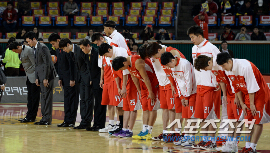 18일 잠실학생체육관에서 프로농구 서울SK와 안양KGC의 경기가 열렸다. 경기 전 헤인즈 징계로 어수선한 서울SK가 팬들에게 사죄의 인사를 하고 있다. 잠실=송정헌 기자 songs@sportschosun.com/2013.12.18