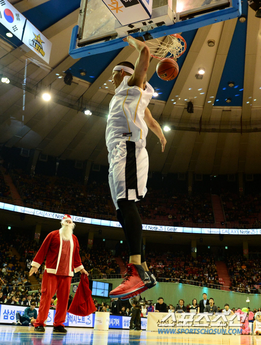 개인 통산 4번째 덩크왕에 등극했다. 이승준은 익숙한 콘테스트를 즐겼다. 예선을 거쳐 올라온 최준용(연세대)을 여유있게 따돌렸다. 이승준은 멋진 이벤트를 만들기 위해 국내 모 대학에서 영어 강사로 일하고 있는 지인을 산타클로스로 변신시키기까지 했다. 그는 "하루 전 모여서 어떻게 하면 팬들에게 재미와 감동을 줄까 고민했다"면서 "이제 덩크슛 말고 3점슛 콘테스트에 참가하는 것도 괜찮을 것 같다"고 말했다. 22일 잠실실내체육관에서 프로농구 올스타전이 열렸다. 올스타전은 매직팀과 드림팀으로 양동근, 김선형을 비롯해 팬 투표와 감독 추천으로 뽑힌 선수 24명이 팀을 나눠 경기를 펼쳤다. 덩크왕에 선발된 이승준이 화려한 덩크슛을 성공시키고 있다. 잠실=송정헌 기자 songs@sportschosun.com/2013.12.22
