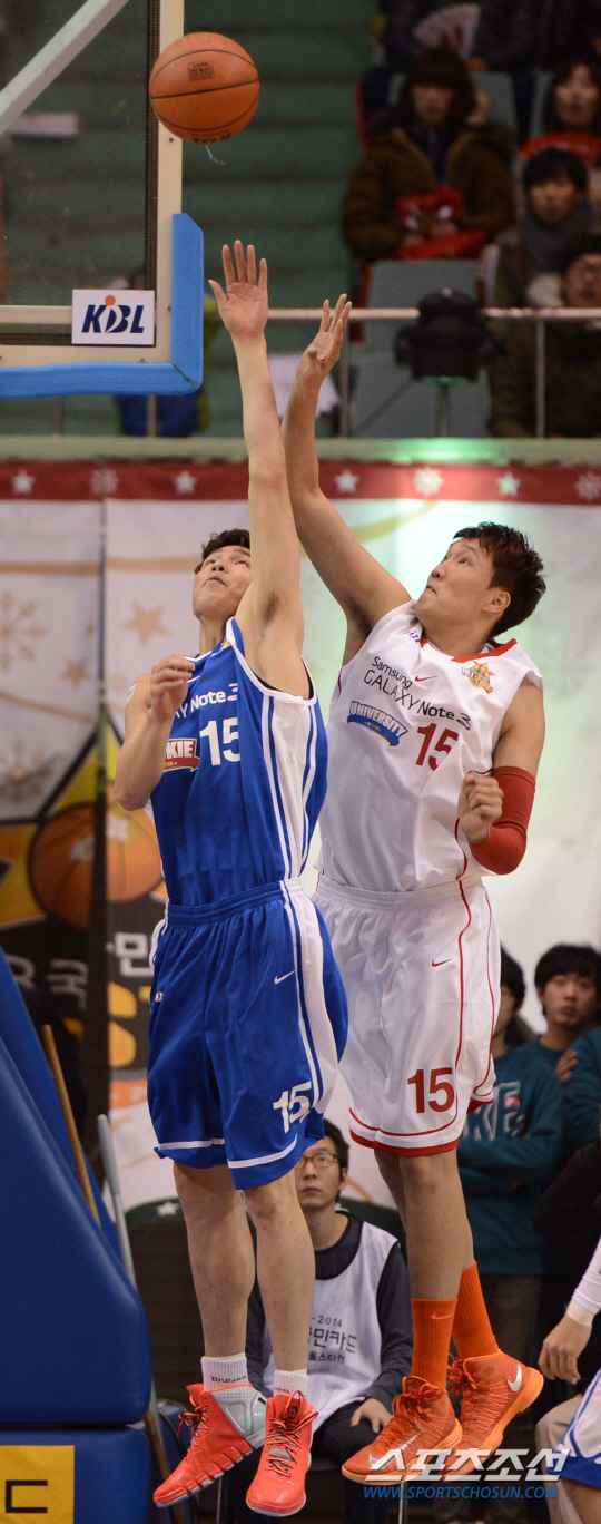 22일 오후 서울 잠실실내체육관에서 2013-2014 프로농구 올스타전이 열렸다. 루키 올스타와 대학 올스타의 경기에서 루키 올스타 김종규(왼쪽)와 대학 올스타 이종현이 루즈볼을 다투고 있다. 잠실실내체=김경민 기자 kyungmin@sportschosun.com / 2013.12.22.