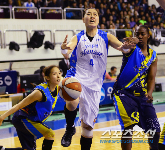 우리은행과 신한은행의 2013-2014 여자프로농구 개막전이 10일 강원도 춘천호반체육관에서 열렸다. 우리은행 이선화가 레이업슛을 시도하다 신한은행 김연주의 수비에 막혀 공을 놓치고 있다. 홈팀 우리은행은 지난 시즌 모두의 예상을 깨고 여자농구 통합챔피언이 됐다. 신한은행은 지난 시즌 이전까지 통합 6연승의 대업을 이룬 전통의 강호다. 춘천=정재근기자 cjg@sportschosun.com/2013.11.10/