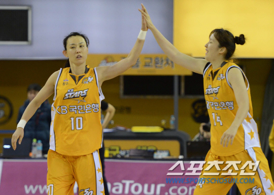 23일 오후 청주실내체육관에서 2013-2014 여자프로농구 KB스타즈와 우리은행의 경기가 열렸다. 4쿼터 3점슛을 성공시킨 KB스타즈 변연하가 김수연과 하이파이브를 나누고 있다. 청주= 김경민 기자 kyungmin@sportschosun.com / 2013.12.23.