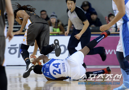 삼성생명과 KB스타즈의 2013-2014 여자프로농구 경기가 29일 용인실내체육관에서 열렸다. KB 커리와 삼성생명 샤데가 루즈볼을 다투고 있다. 용인=허상욱 기자 wook@sportschosun.com/2013.12.29/