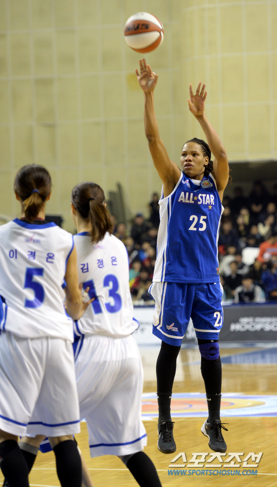 남부선발(신한은행 KB스타즈 삼성생명)이 중부선발(우리은행 KDB생명 하나외환)을 제압했다. 남부선발의 승리를 이끈 커리(KB스타즈)가 MVP에 뽑혔다. 2013-2014 여자프로농구 올스타전이 5일 춘천호반체육관에서 열렸다. 남부선발 커리가 3점슛을 시도하고 있다. 춘천=허상욱 기자 wook@sportschosun.com