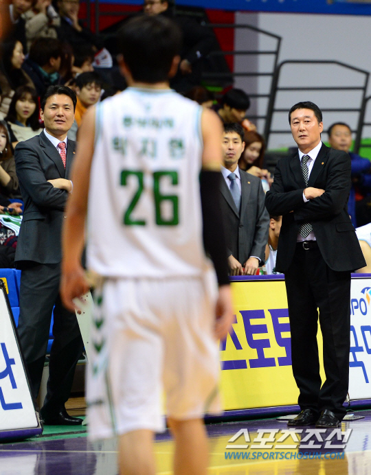 26일 고양체육관에서 프로농구 고양 오리온스와 원주 동부의 경기가 열렸다. 오리온스는 11승15패로 7위, 동부는 8승18패로 9위를 기록하고 있다. 동부 이충희 감독이 김영만 코치와 함께 경기를 바라보고 있다. 고양=송정헌 기자 songs@sportschosun.com/2013.12.26 |