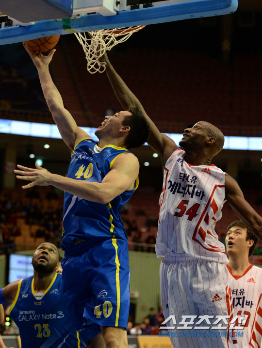 8일 잠실 실내체육관에서 프로농구 서울삼성과-고양오리온스의 경기가 열렸다. 삼성 이동준이 오리온스 리처드슨의 블록을 피해 리버스 레이업슛을 성공시키고 있다. 잠실=송정헌 기자 songs@sportschosun.com/2014.01.08