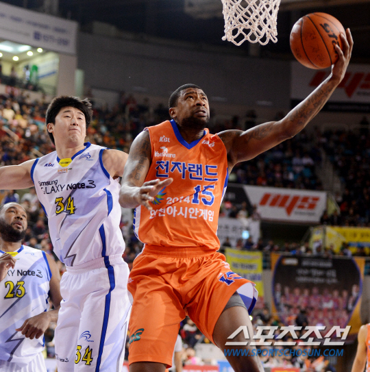 "타고난 주장입니까." "어머니와 통화했는데 이런 말씀을 하셨다. 너는 태어날 때부터 주장의 기질을 갖고 있었다." 리카르도 포웰은 최근 남자농구 전자랜드의 새 주장이 됐다. 그리고 전자랜드는 지난 9일 SK전부터 12일 삼성전까지 3연승을 달렸다. 그는 12일 홈인 인천 삼산실내체육관에서 벌어진 삼성전에선 28득점 15리바운드 더블 더블 활약으로 75대70 승리를 이끌었다. 포웰은 사우스캐롤라이나대 4학년 때 주장을 맡아 지구 우승을 한 적이 있다고 했다. 인천 전자랜드와 서울 삼성의 2013-2014 프로농구 경기가 12일 인천 삼산체육관에서 열렸다. 전자랜드 포웰이 삼성 김명훈의 수비를 제친 후 리버스 레이업슛을 시도하고 있다. 인천=정재근기자 cjg@sportschosun.com/2014.01.12/ |