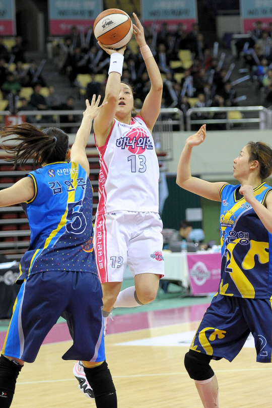 김정은(27)은 하나외환의 간판 스타다. 그가 13일 부천실내체육관에서 벌어진 우리은행 2013~2014시즌 신한은행전에서 극적인 3점 버저비터로 상대를 침몰시켰다. 58대56. 신한은행의 연승행진이 6에서 멈췄다. 김정은은 이날 9번째로 통산 5000득점 고지를 돌파했다. 하나외환은 시즌 5승째.