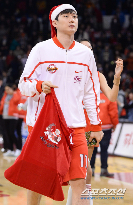 다급해진 삼성 썬더스가 긴급 수혈을 했다. 삼성은 포워드 임동섭이 지난 5일 KCC전에서 발등을 다치면서 남은 시즌 경기 출전이 힘든 상황이다. 임동섭의 결장은 바로 차재영의 출전시간을 늘려주면서 부담으로 작용했다. 게다가 삼성은 최근 3연패의 부진에 빠졌다. 5할 승률에서 계속 멀어지고 있다. 이대로 추락하면 6강 플레이오프가 멀어질 수 있다고 본 것이다. 그래서 변화가 필요했다. 2013-2014 프로농구 서울SK와 서울 삼성의 경기가 25일 잠실학생체육관에서 열렸다. 경기 종료후 산타모자를 쓴 SK 김동우가 팬들에게 선물을 나눠주고 있다. 잠실=최문영 기자 deer@sportschosun.com /2013.12.25/ |