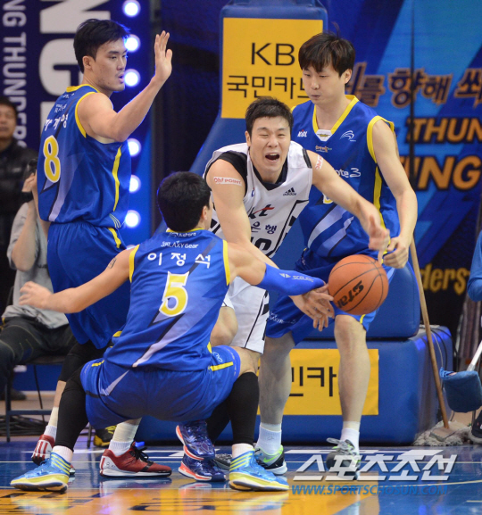16일 오후 서울 잠실실내체육관에서 2013-2014 프로농구 부산 KT와 서울 삼성의 경기가 열렸다. KT 조성민(가운데)이 삼성 이정석(왼쪽)과 김동우 사이에서 볼을 다투고 있다. 잠실실내체=김경민 기자 kyungmin@sportschosun.com / 2014.01.16.