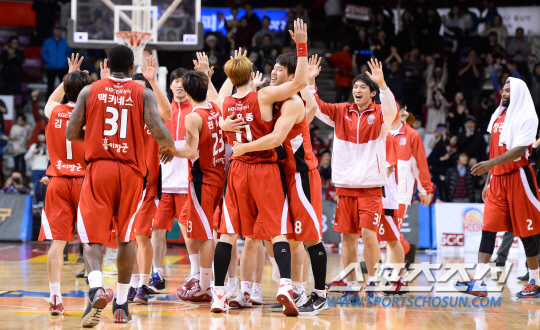 2013-2014 프로농구 안양KGC와 서울SK의 경기가 12일 안양실내체육관에서 열렸다. 안양KGC 선수들이 SK를 83대 79로 제압한후 승리의 기쁨을 나누고 있다. 안양=최문영 기자 deer@sportschosun.com /2014.01.12/ |
